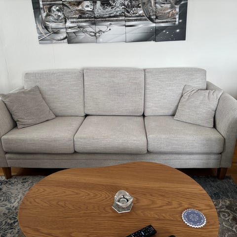 Säljer vår fantastiska 3-sitssoffa 2 sittssoffa samt 1 sits fåtölj/divan pågrund av nyinköp Soffan är otroligt bekväm och rymmer hela familjen. Klädseln är i en slitstark,ljusgrå sammet som är lätt att hålla ren.