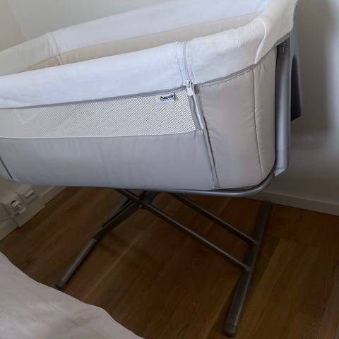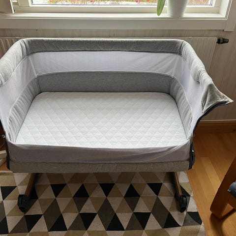 En smart och praktisk bedside crib. Den har hjul och är lätt att flytta samtidigt som hjulen går att låsa. Sängen går att höja och sänka så den passar i höjd till just din säng. Medföljande remmar kan användas för att fästa sängen mot sängramen enligt instruktionerna. Instruktionsboken följer med, samt en praktisk påse ifall ni skulle vara på resande fot. Madrass och textilklädsel är avtagbara för enklare rengöring. Lakan och madrass ingår!