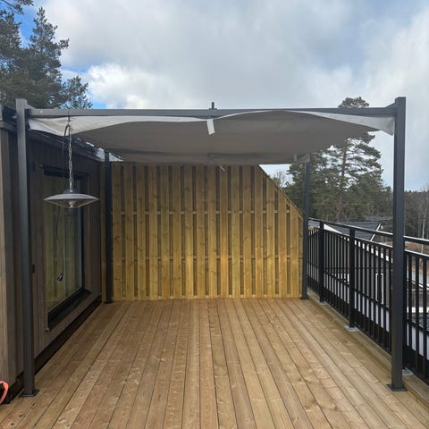 Inglasat uterum med skjutdörrar i aluminium och glas. Uterummet består av flera stora glaspartier i aluminiumprofiler, inklusive skjutbara dörrar för öppning mot altan eller trädgård. Glaspartierna går från golv till tak och ger god ljusinsläpp. Konstruktionen är avsedd att monteras mot husfasad och passar som uterum, vinterträdgård eller inglasad altan. Färg på profilerna är aluminium. Enkelglas