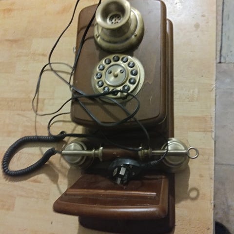 Ericsson R1 väggtelefon i svart utförande. Mekanisk telefon av äldre modell med väggfäste, fast monterad mikrofon och separat lur. På baksidan finns originalskylt med modellbeteckning R1. Passar som inredningsdetalj eller samlarobjekt. Funktion ej testad.