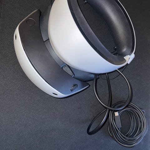 Sony PlayStation VR2 VR-headset med tillhörande handkontroller och in-ear-hörlurar i vit och svart färg. Headsetet är avsett för virtuell verklighet tillsammans med kompatibel PlayStation-konsol. Paketet inkluderar två rörelsekänsliga handkontroller med ringdesign samt ett par trådbundna in-ear-hörlurar som fästs i headsetet. Utrustningen är anpassad för spel och upplevelser i VR-miljö.