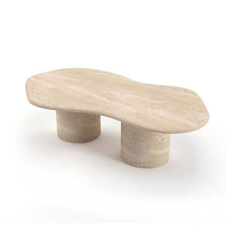 Säljer ett elegant soffbord i travertin med modern, tidlös design. Bordet har en stabil konstruktion där den tunga skivan ligger på två v formade ben.