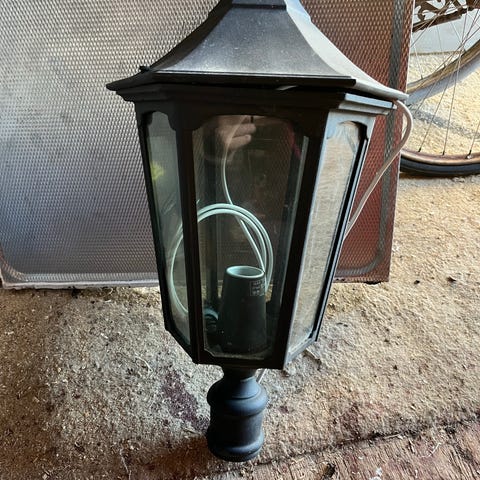 Lampan i kraftig vit plast, handtag i bruntplast (skinnimitation) Antal: 8st á 200kr