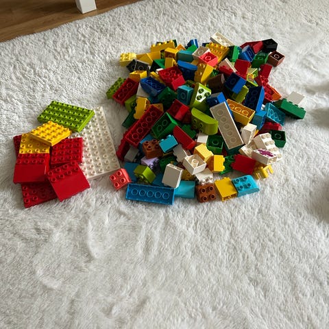 Lego Duplo klossar blandat set med olika delar. Innehåller toy story, jurrasic world, STOR tågbana med elektriskt lok, broar, växlar och övergångar. Det finns djurpark, rymdraket, brandbil, massor av andra fordon, gubbar, verktyg mm.