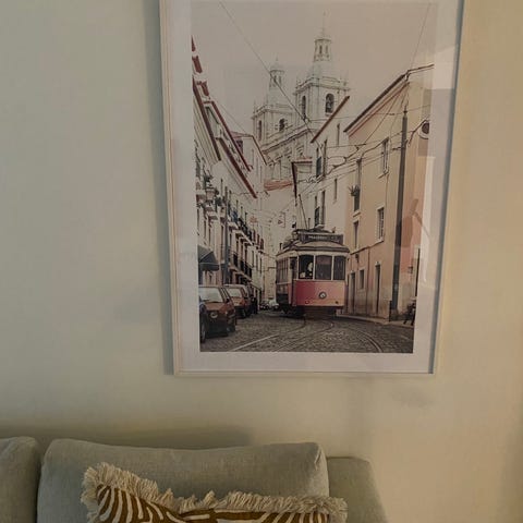 Konsttryck med abstrakt motiv i flera färger, bland annat blått, gult, rött och beige. Verket är inramat med glas och ljus passepartout. Tavlan passar som väggdekoration i exempelvis vardagsrum, sovrum eller kontor.