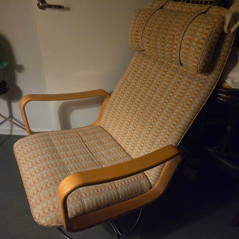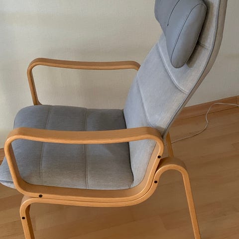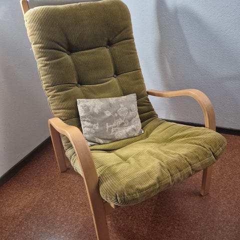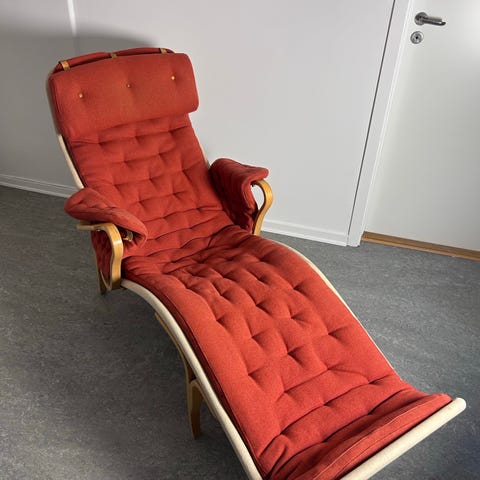 Skön och rymlig. Sitsen är 55 cm bred och 50 cm djup. Tyget är helt och fint.