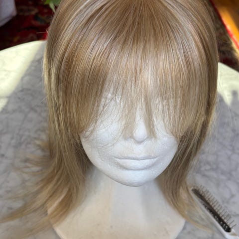 Peruk i kort frisyr med lätt uppklippta längder. Färgen är en brun mix med ljusare slingor.
