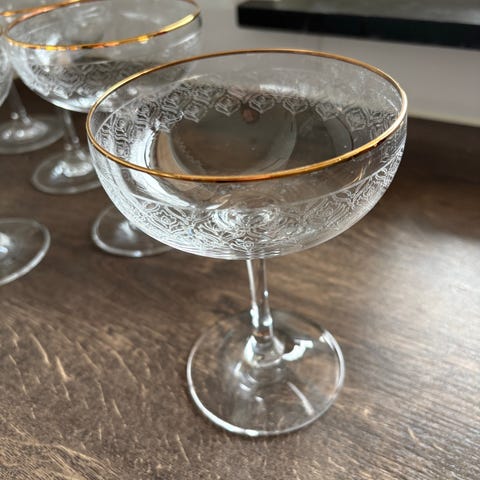 1st remmare, bärnstensfärgad fot, kupa med syraetsad dekor samt guldkant.
