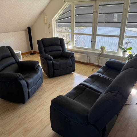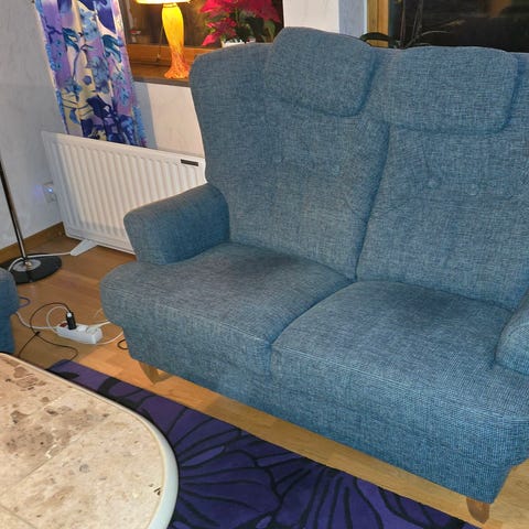 Soffa 3-sits i blå tyg. Soffan har tre sittplatser med separata ryggdynor och nackkuddar. Ryggstödet har dekorativa knappar och sitsen är hel med tre sittkuddar. Passar som sittmöbel i vardagsrum eller liknande utrymme.