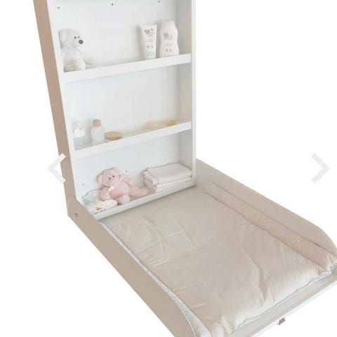 BabyDan skötbord i grå färg med en låda och två öppna hyllplan. Översta planet är utformat som skötyta med kanter runtom. Möbeln är fristående och anpassad för blöjbyte och förvaring av babyartiklar. Mindre märken och skav i lacken förekommer, se bilder för exempel.