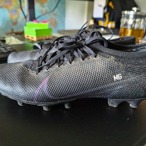 Nike Mercurial Vapor 14 Pro FG fotbollsskor i färgen black/iron grey med blå detaljer. Skorna är avsedda för spel på fasta naturgräsplaner (FG) och har dobbar anpassade för detta underlag. Storlek EU 36,5 (UK 4,5, 23,5 cm). Ovandel i syntetmaterial med snörning för justerbar passform. Lämpliga för fotbollsspelare som söker en lätt sko för spel på naturgräs.