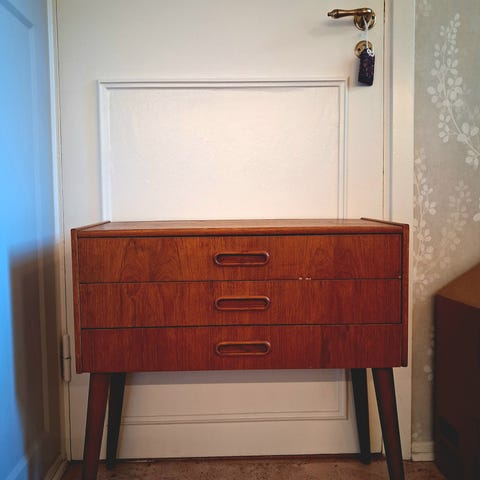 Välvårdad liten möbel som kan användas som både sängbord, hallmöbel eller sidobord. I teak samt mässingdetaljer, 1950/60tal. Klassisk mid century design.