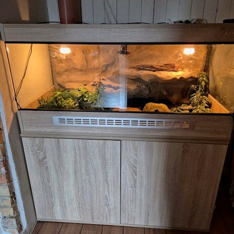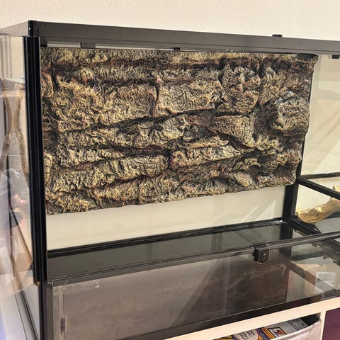 Glasterrarium med tre hyllplan i glas anpassade för gerbiler. Har ventilationsplåt och skjutdörrar i glas. Baksidan har en svart plast påsatt - den kan tas bort. Bredd 50cm, djup 40 cm, höjd 60 cm. Kan passa även för andra djur eller reptiler. Kan bli riktigt fint med rengöring och lite omsorg.