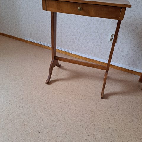 Bordet ljust äkta träslag, troligtvis björk. Svarvade ben, tre stycken.