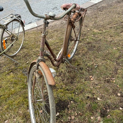 Crecsent. Antik cykel säljes. Sadel i skinn, handtag i trä. Använde den förr, men sedan har den blivit stående (inomhus). Dålig broms. Troligtvis punktering.
