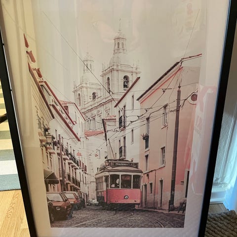 Tavla med motiv av spårvagn i stadsmiljö. Bilden föreställer en spårvagn som kör genom en smal gata med omgivande byggnader och kyrktorn i bakgrunden. Tavlan är inramad med en ljus ram och passar som väggdekoration i exempelvis vardagsrum, hall eller sovrum.