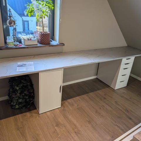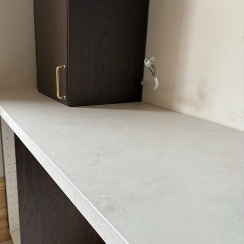 Bänkskiva i vit marmorlook med diskreta grå ådringar. Passar exempelvis kök,
