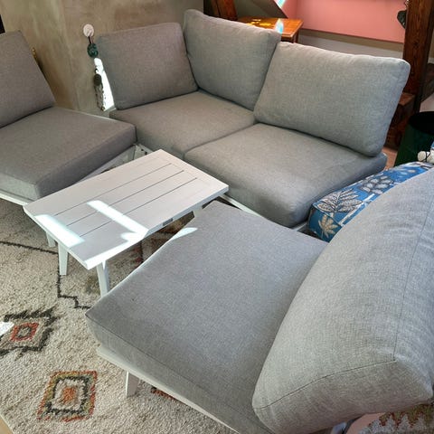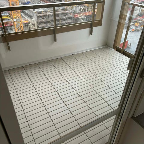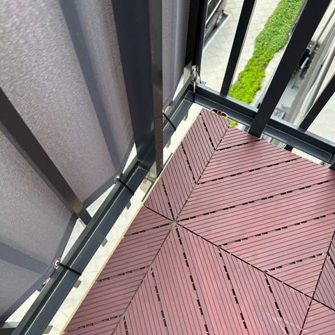 Balkonggolv bestående av sammankopplade plastplattor i grå färg med perforerat mönster.