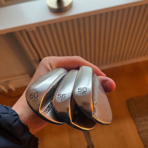 Titleist Vokey Design SM8 wedgar med loft 50° 12F och 56° 12D. Skårerna är fortfarande fräscha så det går att få bra med spinn.
