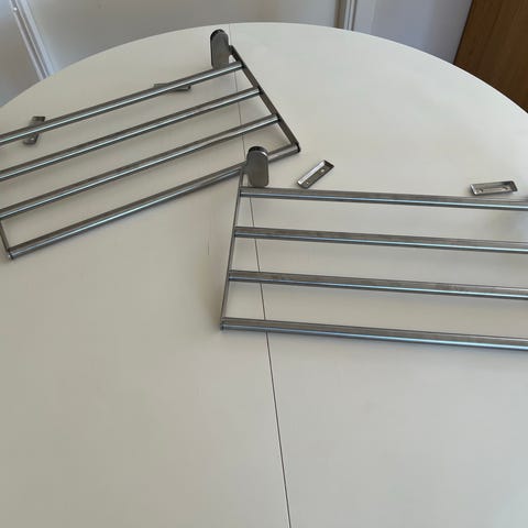 Oanvänd Smedbo dubbel handdukshängare i kromad metall. Väggmonterad modell med två parallella stänger för upphängning av handdukar i badrum eller tvättstuga. Monteringsfästen på båda sidor, skruvhål på baksidan av fästena 600 mm mellan skruvhålen. Passar för inomhusbruk i våtutrymmen.