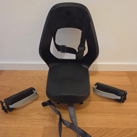 Cykelbarnstol grå med sele och fotstöd