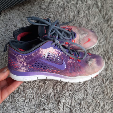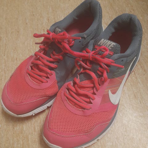 Nike löparskor i storlek 38. Skorna är i färgerna rosa och vit med snörning framtill. Ovandelen verkar vara i mesh och syntetmaterial för ventilation och låg vikt. Yttersulan är anpassad för löpning och vardagsmotion. Passar för användning vid träning, promenader eller som fritidsskor.