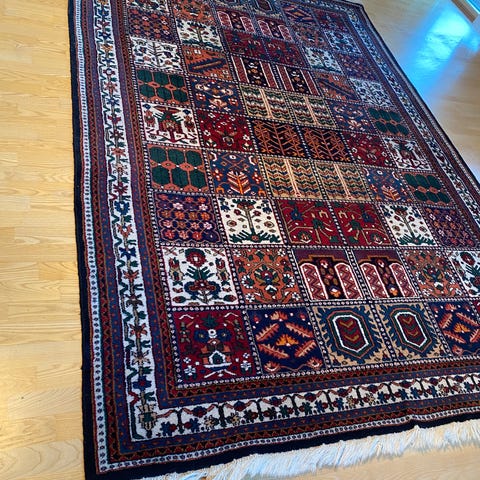 Persisk handknuten matta. Storlek ca 214x126 cm enligt etikett. Liten defekt - se bilder. I övrigt fin.