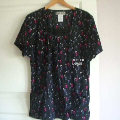 Elegant svart klänning med axelvaddar och ett vackert utanpåliggande spets i blommönster. Böljande kjol med inslag av enfärgat svart tyg. Bystmått 96 cm och hel längd 125 cm. Tyngd i tyget så den faller otroligt snyggt. Sparsamt använd så mycket fint skick.