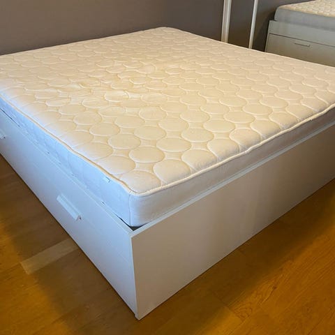 IKEA sängram modell Malm med madrass och förvaringslådor under.