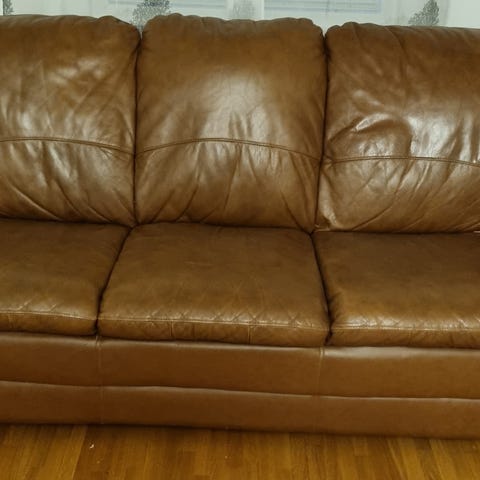 Soffgrupp bestående av en tvåsitssoffa och en tresitssoffa i brunrött skinnliknande material. Sofforna har hög rygg och stoppade armstöd, anpassade för vardagsrum eller allrum.