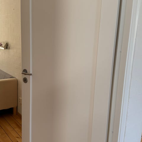 Vit innerdörr med slät yta. Dörren är utrustad med handtag och låscylinder. Passar som rumsdörr inomhus i bostad eller liknande miljö. Dörrbladet är högerhängd enligt bilderna. Mått och exakt material framgår inte av uppgifterna och kan behöva mätas på plats.