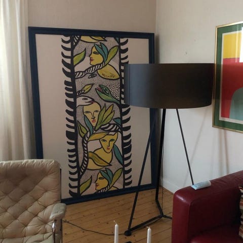 Golvlampa Evedal från Ikea med tung marmorfot (äkta), massiv ek, mässingsdetaljer, munblåst glas i grått! Säljs inte längre!