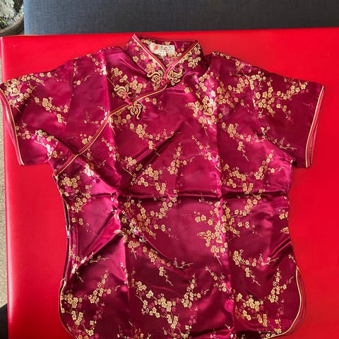 Kortärmad damtopp i röd bomull i blandade storlekar från L- XXL. 4 stycken totalt.(1x L, 2x XL , 1 x XXL ) Modellen har svart kantband och dekorativa knäppdetaljer framtill samt ett mönster på nedre delen av framsidan. Passar som vardagstopp eller till enklare festligare tillfällen. De är något skrynkliga. Säljs för alla 4.