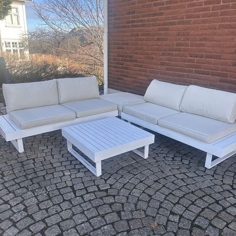 Hörnsoffa med bord i svart färg. Soffan är utformad som en L-formad hörnsoffa med flera ryggkuddar för sittkomfort. Bordet är rektangulärt och anpassat för att stå tillsammans med soffan, vilket gör möbelgruppen lämplig som sitt- och matplats i exempelvis utemöbler