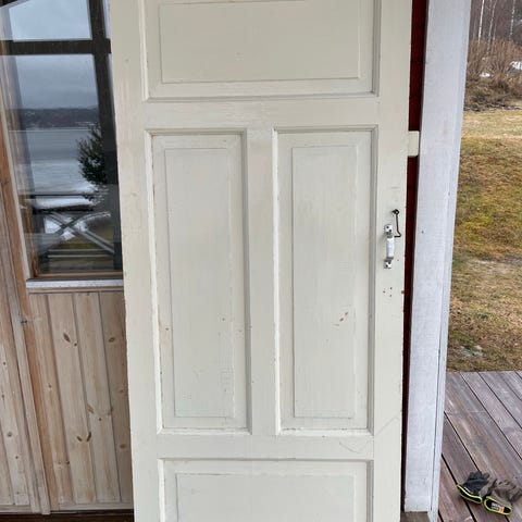 Vit ytterdörr med glasruta och spröjs. 9x20