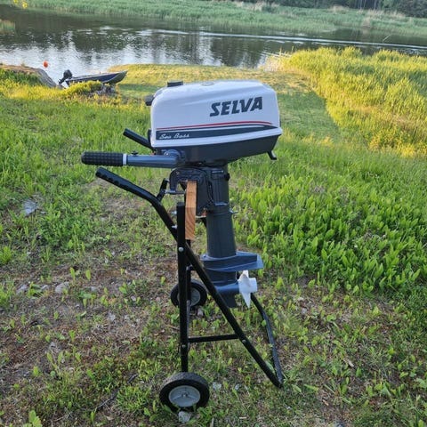 Liten & lätt 1-cylindrig 4-takts utombordsmotor på 5hk. Bärhandtag för enkel transport. Sidomonterad växelspak med fram, neutral och back.