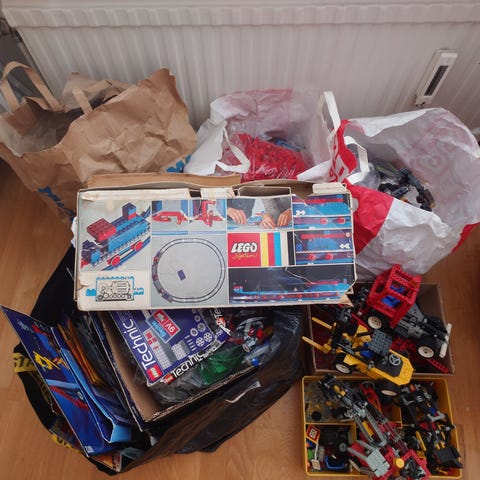 Många av bitarna ligger i mindre lådor (inuti den stora lådan) sorterade av mig för länge sedan i oklara kategorier, men finns där. Självklart ingår alla lådor.