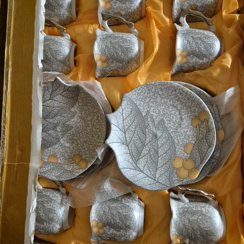 6 koppar med fat . 6 Assietter oxå. En mjölk kanna .