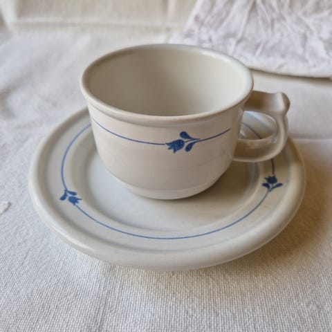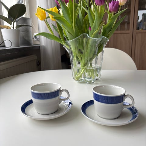 Rusta kaffekoppar med fat i porslin. Setet består av koppar och tillhörande fat i vit grundfärg med blå blommönstrad dekor och enkel blå linje runt kanten. Passar för servering av kaffe, te eller andra varma drycker vid vardagsbruk eller fika. Kopparna är stapelbara och faten har en markerad yta för koppens botten, vilket ger stabil placering vid användning. Maskin tåliga .