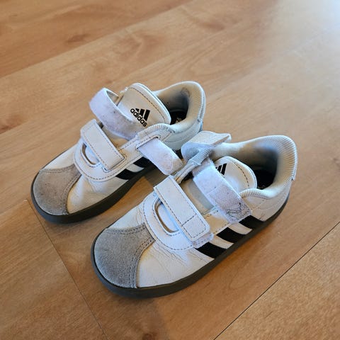 Adidas Superstar sneakers för barn, unisexmodell i storlek 30. Skorna är vita med svarta ränder och gummisula. Ovandel i syntetmaterial med klassisk shell toe-tå och tre kardborreband över foten för enkel av- och påtagning. Passar till vardagsbruk och fritidsaktiviteter.