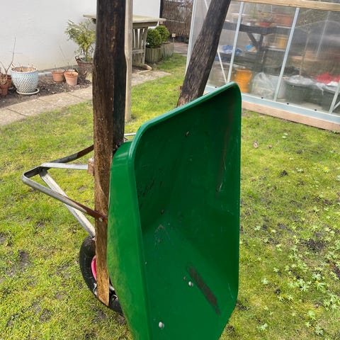 Säckkärra i metall med två luftgummihjul. Lämplig för transport av lådor, säckar och annat gods i trädgård, garage eller vid flytt. Utrustad med bygelhandtag och lastplatta framtill för enklare hantering av tyngre föremål.