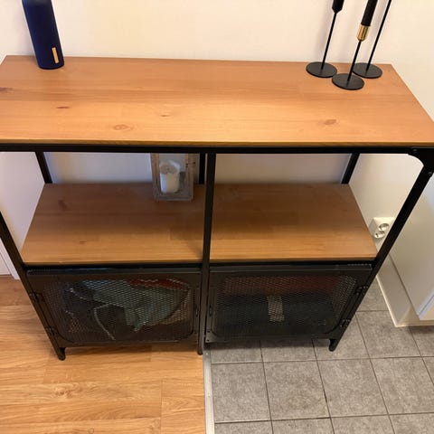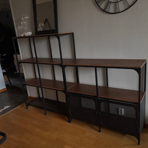 IKEA hyllsystem i kombination av metall och trä i färgerna svart och brun. Består av öppna hyllplan samt nederdel med skåpsdelar/dörrar i metallnät. Passar för förvaring av böcker, dekoration, mediautrustning eller annan förvaring i vardagsrum, hall eller arbetsrum. Industriell stil med synlig metallram och träskivor på hyllplanen.