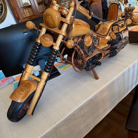 Handgjorda fordon i form av motorcyklar och bil i trä samt en mindre motorcykel i metall med färgglad lackering. Trämodellerna är detaljerade med utskurna hjul, skärmar och styren, och föreställer klassiska motorcyklar och en äldre personbil. Metallmotorcykeln har målade dekorer i flera färger och små detaljer som styre, speglar och fotpinnar, gjord av läskburkar. Passar som prydnadsföremål eller samlarobjekt. Exakta mått och tillverkare är okända.