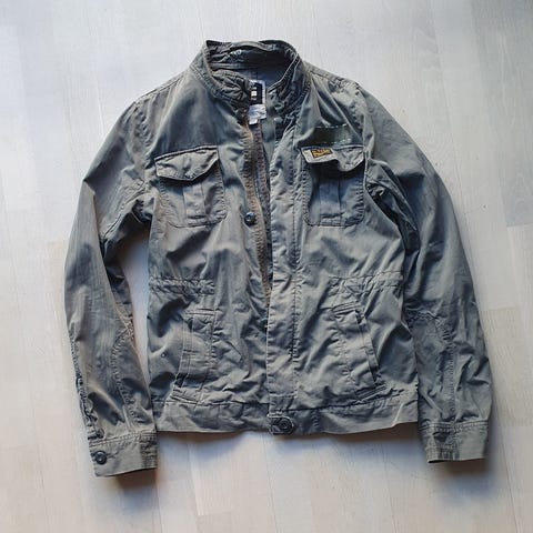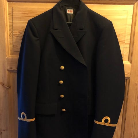 Vädertålig varm jacka med yllefoder och axelklaffar. Krage klädd i marinblått kläde. Knäppning med såväl knappar som rejält blixtlås.