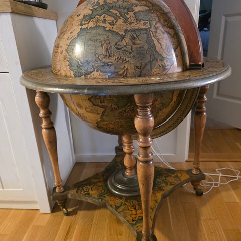 Jordglob barskåp på ställning i brun träimitation. Globdelen är utformad med antik stil och kan öppnas upptill för förvaring av flaskor och glas i det inre facket. Runt globen finns en dekorativ ring med motiv. Ställningen har svarvade ben och kryssfot för stabilitet. Passar som förvaringsmöbel och inredningsdetalj i vardagsrum, matsal eller kontor.