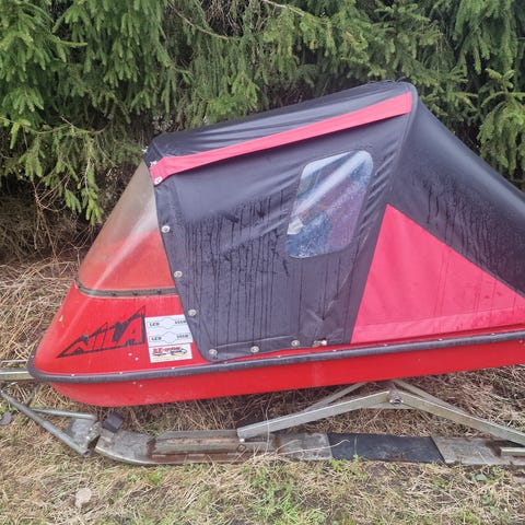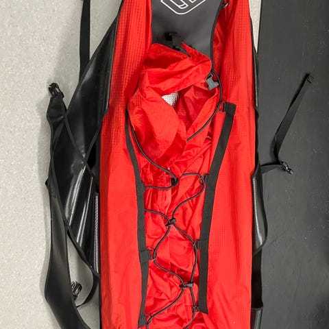 Har små revor som lagats med röda nylonlappar så att det knappt syns.