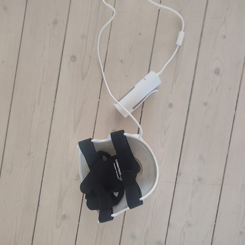 Currentbody Skin LED-ansiktsmask i vit färg. Masken är utformad för användning i ansiktet och har utskärningar för ögon, näsa och mun samt remmar för att fästa den runt huvudet. Produkten ansluts med kabel till strömkälla eller kontrollenhet (ej synlig på bilden). Levereras i originalkartong med Currentbody Skin-märkning.