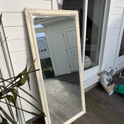 spegel med vit ram. Rektangulär helkroppsspegel som kan användas stående mot vägg eller monterad på vägg beroende på upphängning. Vit profilerad ram i klassisk stil. Passar i till exempel hall, sovrum eller vardagsrum för helkroppsreflektion och som inredningsdetalj. Liten spricka i nederkant