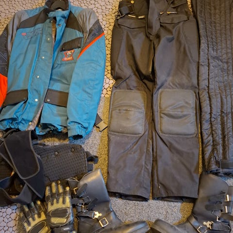 Handskar Orina stl 6, Stövlar Outlast stl 37, Jacka o byxor Hjalmarsson stl 38 rep 36, Hjälm Arai stl 53-54 + ryggskydd. Allt använt få ggr