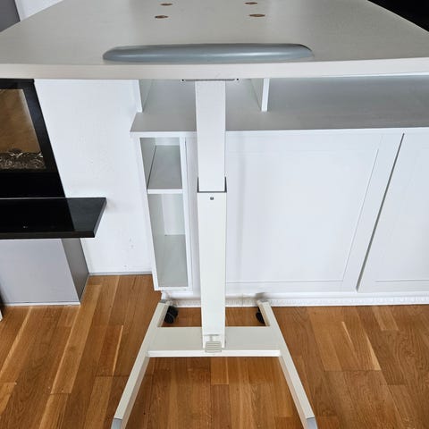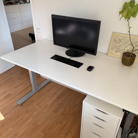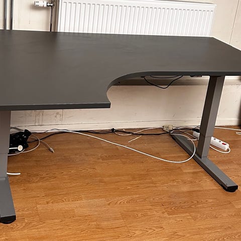 Säljer vårt höj- och sänkbara hörnskrivbord i lackerad ekfanér från IKEA. Bordet är i mycket fint skick utan repor, skav eller andra märken.